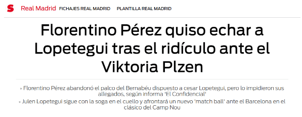 Según cuena el diario Sport, ni bien terminó el partido, Florentino Pérez tenía decidido a despedir al entrenador.