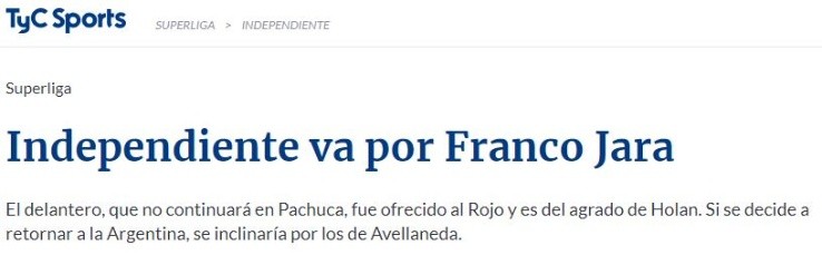 Según detalló TyC Sports, el artillero Franco Jara, que no continuará en el Pachuca de México a partir de la próxima temporada, fue ofrecido a Independiente. Además, el medio explicó que, de tomar la decisión de retornar al país, el atacante tendría como prioridad hacerlo en el Rojo.