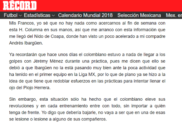 “Ya recordarán que hace unos días el colombiano estuvo a nada de llegar a los golpes con Jérémy Ménez durante una práctica”, recordó el personaje agregando que esa situación se dio porque Ibargüen se está matando en las prácticas intentando ganarse un lugar.