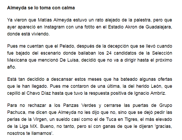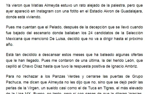 Por eso, según explica el Francotirador de Récord, Almeyda no rechazó la oferta, pero pidió un contrato millonario. El segundo más alto de la Liga MX.