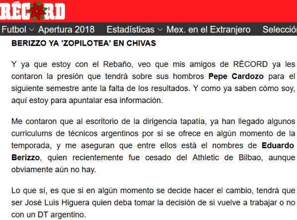 En su columna de hoy, el periodista de Récord reveló que la directiva de Chivas, en caso de que José Cardozo siga por este rumbo de malos resultados, iría a buscar a Eduardo Berizzo.