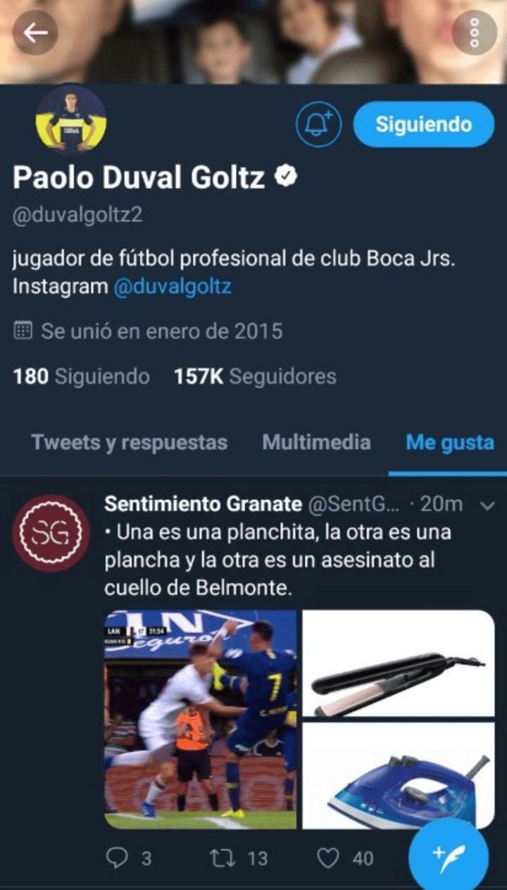 PaoloGoltz, quien aún se encuentra recuperándose de una lesión que lo tiene alejado de las canchas, reaccionó a un posteodel usuario @SentGranateen el cual hizo referencia a la situación con un juego de imágenes y palabras: “Una es una planchita, la otra es una plancha y la otra es un asesinato al cuello de Belmonte”.