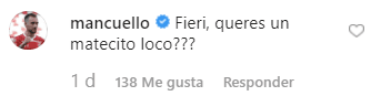 El argentino fue más alla y le hizo recordar el caso que lo sacó 14 meses de las canchas. “Fieri, queres un matecito loco???”, escribió Mancu en un comentario que molestó algunos peruanos.