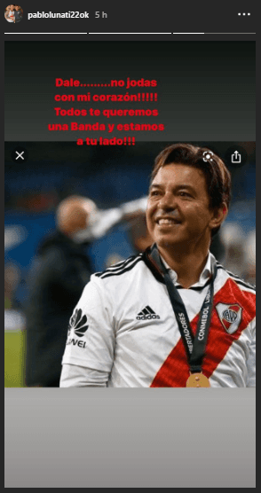 Mediante su cuenta de Instagram, uno de los tantos seguidores del Millo que le dejó un mensaje de apoyo a Gallardo fue nada más ni nada menos que Pablo Lunati. El ex colegiado, adjuntando una postal suya junto al DT, escribió: “¡Fuerza MUÑE!No hagas que se me explote el corazón otra vez. Dale hermano, ¡el finde hay que ir a Santa Fe!”.