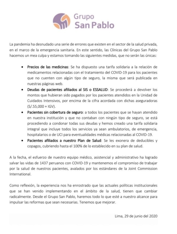 Este lunes, después del escándalo, la clínica San Pablo sacó un comunicado buscando calmar las aguas. Hicieron mea culpa y aludieron a que fue un error.