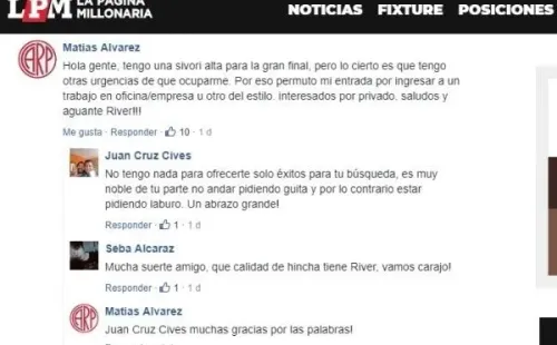 A través de un comentario en ‘La Página Millonaria’, este hincha de Riverofreció su entrada a cambio de un trabajo de oficina o empresa.“No busco sacar plata de la reventa”, aseguró Álvarez en diálogo con dicho sitio.