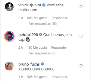 “Que buenos jeans capi”, le escribió Betoto. Bruno Fuchs de Inter de Porto Alegre fue otro que también comentó. Eso pasa con el Depredador, pues como dijimos, es bastante popular en el mundo del fútbol.