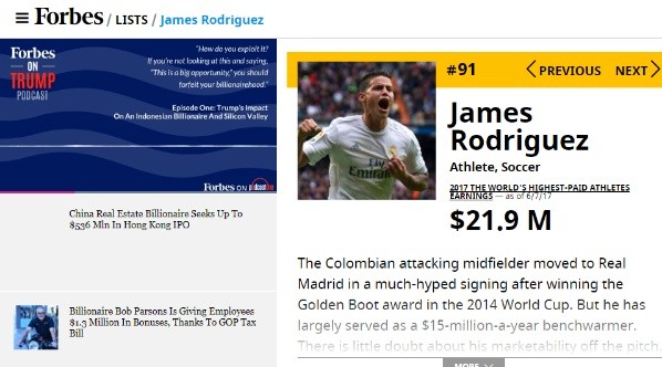 La publicación de la famosa Forbes, reúne a los 100 deportistas mejor pagos del planeta, allí se encuentra el colombiano James Rodríguez ocupando la posición 91 y en el tema de fútbol, el cafetero es el noveno mejor pagado.