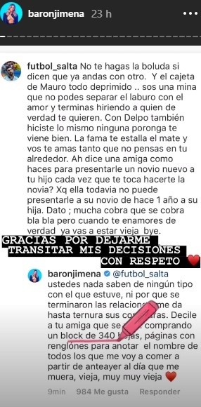 “Ey culiados, yo no estoy desbordada por mi laburo, entiendo que les joda a varios lo que me está pasando pero estoy atravesando un momento laboral increíble. Nadie se separa por trabajo, al menos no yo. Mi hijo está joya, somos muy felices y aprovechamos mucho el tiempo juntos. Con respecto a los comentarios que intentan ser denigrantes preguntándose cuánto faltará para que esté con otro, ya conocen mi apetito sexual, así que calculo que falta re poco. Y no intenten señalar eso como una flaqueza, no se gasten, no sean giles. Vayan a vivir sus vidas”, tiró. Clarito.