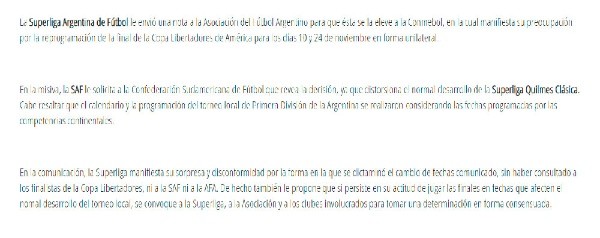 “LaSAFle solicita a la Confederación Sudamericana de Fútbol que revea la decisión, ya que distorsiona el normal desarrollo de laSuperliga. Cabe resaltar que el calendario y la programación del torneo local de Primera División de la Argentina se realizaronconsiderando las fechas programadas por las competencias continentales”, escribieron en el comunicado. ¿Lo tendrán en cuenta?