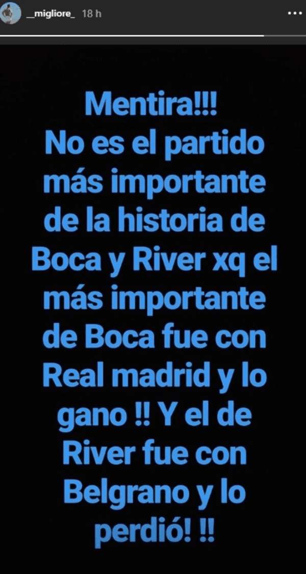 “¡¡¡Mentira!!! ¡¡No es el partido más importante de Boca y River porque el más importante de Boca fue con Real Madrid y lo ganó!! ¡¡Y el de River fue con Belgrano y lo perdió!!”, escribió.