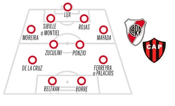 Según lo que dejó ver el entrenador, la formación de River sería con Lux; Moreira, Sibille o Montiel, Rojas y Mayada; De La Cruz, Zuculini, Ponzioy Ferreyra o Palacios; Beltrán y Borré.