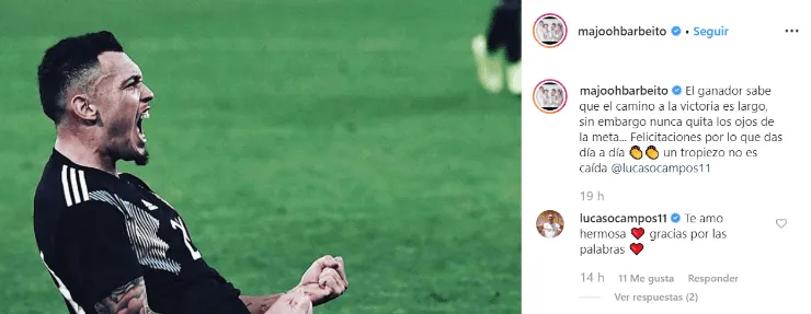 Claro, la lesión no pasó desapercibida en el entorno del jugador. De hecho, Majo Barbeitolanzó en su cuenta de Instagram: “El ganador sabe que el camino a la victoria es largo, sin embargo nunca quita los ojos de la meta… Felicitaciones por lo que das día a día un tropiezo no es caída@lucasocampos11”