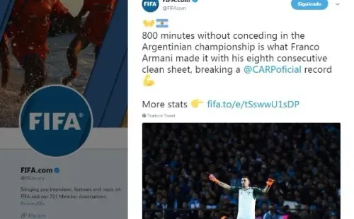 “800 minutos sin ceder en el campeonato argentino es lo que Franco Armani hizo en ocho partidos consecutivos, rompiendo un récord en River”, escribieron desde las plataformas oficiales.