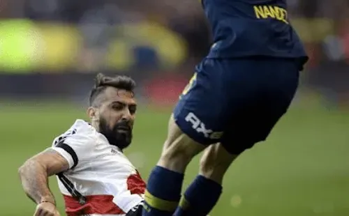 El de River fue al piso mientras que el uruguayo, con sus dos pies para adelante, intentó de que la pelota quede para su lado. ¡Con todo!