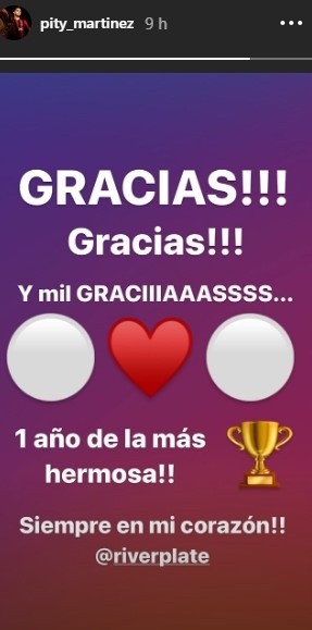 “Gracias, gracias y mil gracias. 1 año de la más hermosa, siempre en mi corazón River”, expresó.