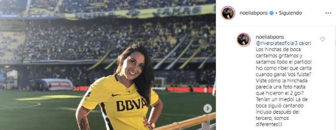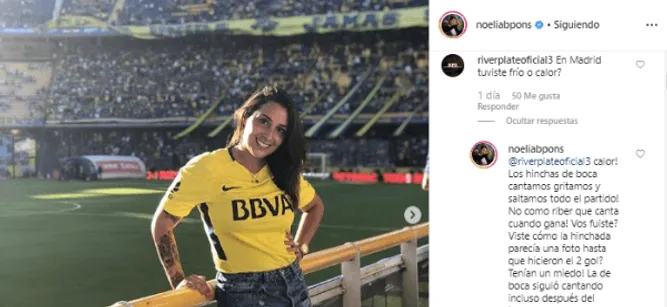 Arremetiendo contra el hincha del Millonario, Noelia no se quedó callada y replicó: “Calor! Los hinchas de boca cantamos gritamos y saltamos todo el partido! No como riber que canta cuando gana! Vos fuiste? Viste cómo la hinchada parecía una foto hasta que hicieron el 2 gol? Tenían un miedo! La de boca siguió cantando incluso después del tercero, somos diferentes!!!”.