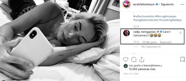 “Hablando contigo”, escribió ella.Radja Nainggolan, exfutbolista de La Roma, la saludó con un comentario y le pidió que lo salude de parte de él.
