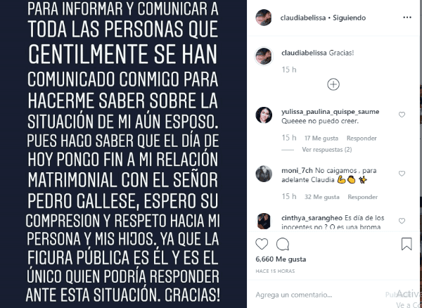 Y cerró: “Hago saber que el día de hoy pongo fin a mi relación matrimonial con el señor Pedro Gallese, espero compresión y respeto hacia mi persona y mis hijos ya que la figura pública es él y es el único quien podría responder ante esta situación”.
