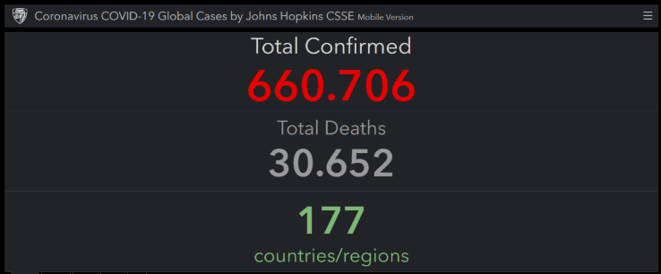 Según el informe en tiempo real de Johns Hopkins CSSE, son más de 660 mil casos confirmados por coronavirus. Hasta ahora, hay que lamentar treinta mil muertos. Una cifra gigante.