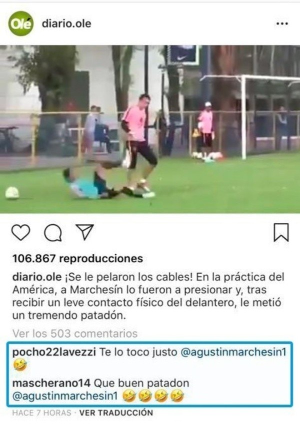 “Que buen patadón” fue lo que escribió el ex Barcelona. “Te lo tocó justo” comentó el delantero. Ambos comentarios fueron seguidos de emojisriéndose de lo que había protagonizado su compatriota.