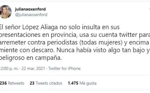 “El señor López Aliaga no solo insulta en sus presentaciones en provincia, usa su cuenta twitter para arremeter contra periodistas (todas mujeres) y encima miente con descaro. Nunca había visto algo tan bajo y peligroso en campaña”, escribió la comunicadora de ATV.