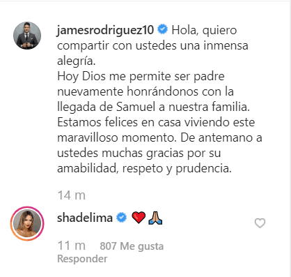 Shannon en el Instagram de James no fue muy expresiva, pero le puso un corazón y un signo de agradecimiento a la publicación que hizo el volante del Real Madrid.