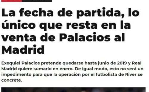 Sin embargo, hay una traba para que se efectivicela transferencia de Palacios a Real Madrid: el jugador y River quieren que se mantenga en Argentina hasta junio, mientras que el Merengue lo quiere sumar en enero.