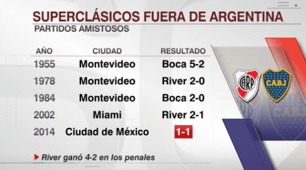 Según detalló ESPN, en 1955, más precisamente enMontevideo,Uruguay, se disputó el primer Superclásico fuera de Argentina.Boca no tuvo piedad con su rival histórico y se impuso por 5 a 2.