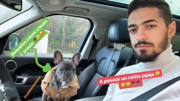 El jugador del West Ham compartió una foto junto a la mascota en su auto, que llamó la atención por el abrigo que esta lleva puesto.