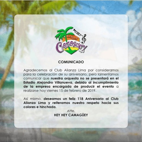 “Agradecemos al Club Alianza Lima por considerarnos para la celebración de su aniversario, pero lamentamos comunicar que nuestra orquesta no se presentará en el Estadio Alejandro Villanueva, debido al incumplimiento de la empresa encargada de producir el evento a realizarse hoy viernes 15 de febrero de 2019”, argumentaron.