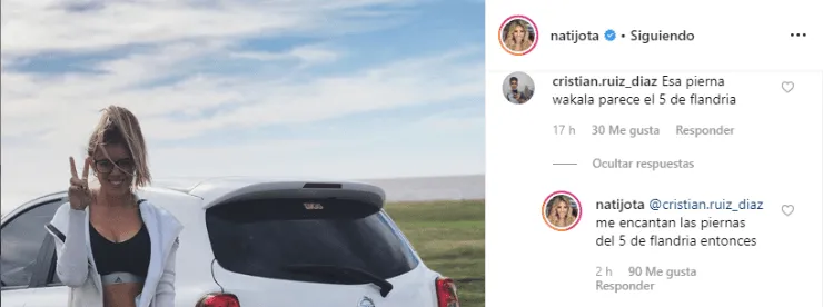 Luego de varias respuestas llegó la de Nati, que se puso a la altura y dejó en ridículo a Cristian. “Me encantan las piernas del 5 de flandria entonces”, escribió.