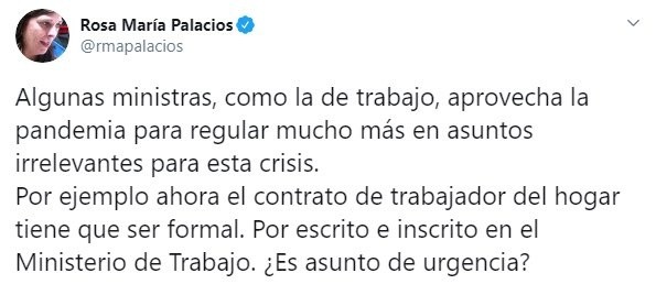 “Algunas ministras, como la del trabajo, aprovecha la pandemia para regular mucho más en asuntos irrelevantes para esta crisis”, comenzó la comunicadora. “Ahora el contrato del trabajador del hogar tiene que ser formal ¿Es asunto de urgencia?“, continuó.