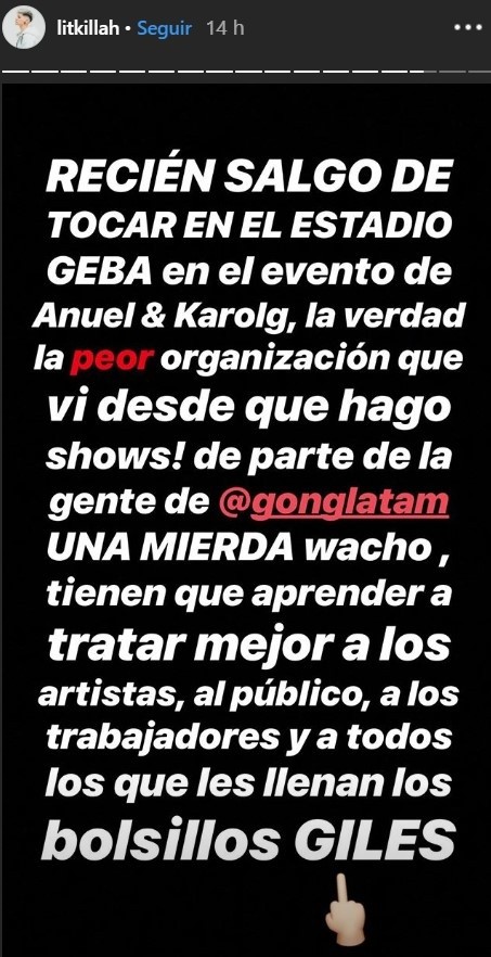 La organización no fue buena y el evento arrancó muy tarde. Por, esto, Liberman escribió: “Ayer este chico Anuel empezó su recital con más de 2 horas de demora. No tuvo ningún contratiempo ni nada parecido. Solo su “capricho” de estrella fugaz y “cagarse” en la gente q pago hasta $10.000 por un lugar en GEBA. Si son mis fans, que me esperen dijo. #pocoprofesional”.
