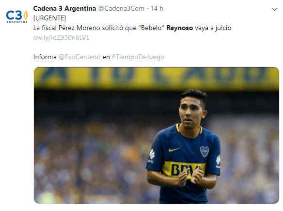 La fiscal María Eugenia Pérez pidió que BebeloReynoso, quien llegó en enero de 2018 procedente de Talleres, vaya a juicio por un tiroteo ocurrido en Ituzaingo, Córdoba, en mayo de 2017.
