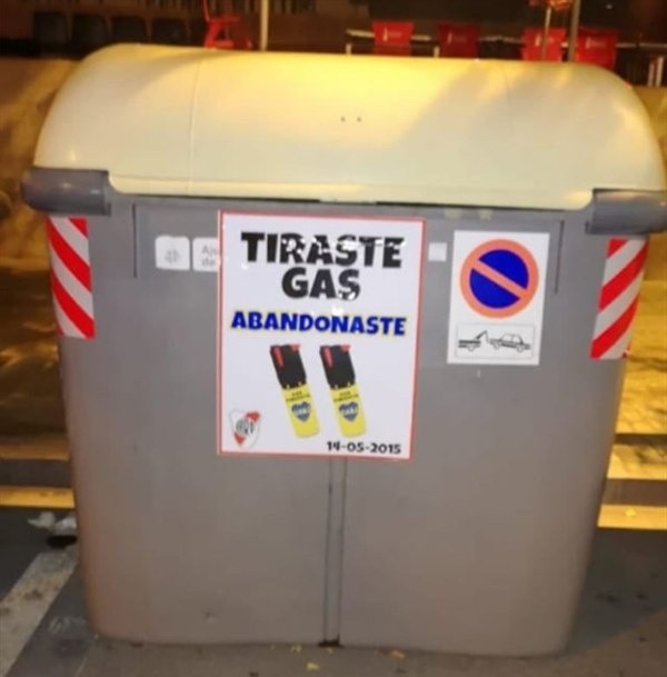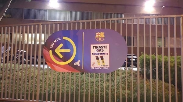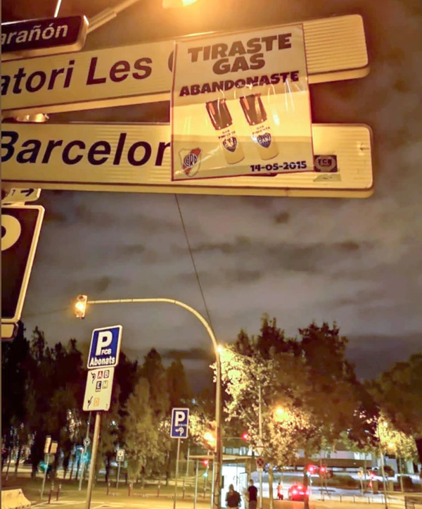 Recordando el cruce por Copa Libertadores que tuvo que ser suspendido fruto de la agresión de algunos hinchas de Boca a los jugadores de River, carteles con el emblema “Tiraste gas” aparecieron en sectores cercanos al CampNou.