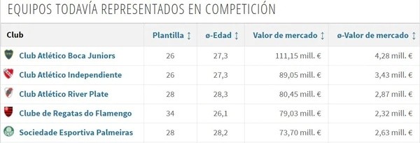 En esta oportunidad, Transfermarkt se encargó de determinar el valor de las instituciones que aún se encuentran con vida en el torneo.