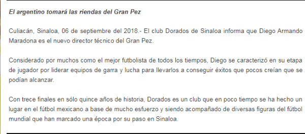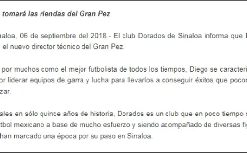 “Considerado por muchos como el mejor futbolista de todos los tiempos,Diego se caracterizó en su etapa de jugador por liderar equipos de garra y de lucha para llevarlos a conseguir éxitos que pocos creíanque se podían alcanzar” fue el comunicado que difundió el club de Sinaloa para anunciar una de las contrataciones más rutilantes del mercado de pases.