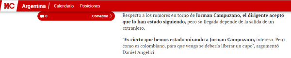 El dirigente, sincerándose, confesó:“Es cierto que hemos estado mirando a Jorman Campuzano,interesa”.
