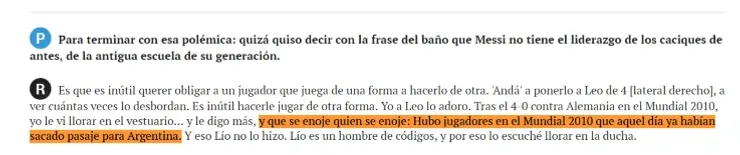 “Tras el 4-0 contra Alemania en el Mundial 2010, yo lovi llorar en el vestuario. Y te digo más: que se enoje quien se enoje, pero en el 2010 hubo jugadores que aquel día ya habían sacado pasaje para Argentina. Y eso Liono lo hizo porque es un hombre de códigos”.Durísimo.
