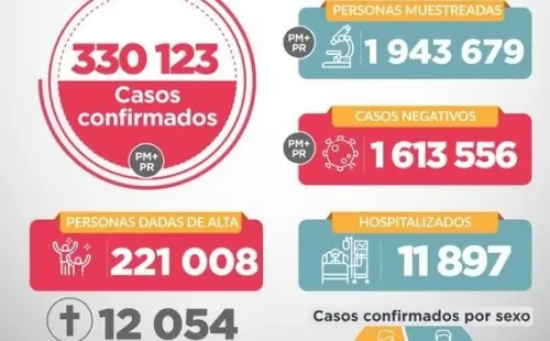 En el nuevo informe, señalaron que se las 1’943,679 personas muestreadas, 330,123 casos resultaron positivos. Las muertes llegaron a 12,054, o sea 184 más en las últimas 24 horas.
