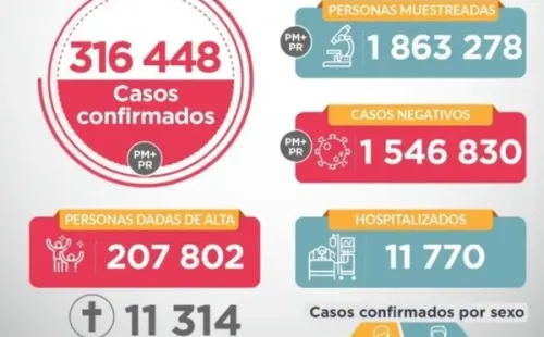 En el nuevo informe, señalaron que de las 1’863,278 personas muestreadas, 316,448 casos resultaron positivos. Las muertes llegaron a 11,314, o osea 181 más en las últimas 24 horas.
