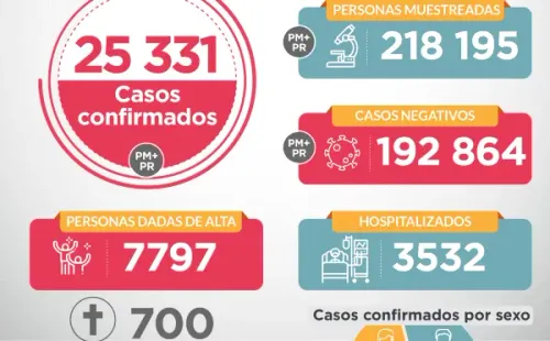 Anunciaron que los casos llegaron a 25 331 de un total de 218 195 pruebas realizadas, lo que da un porcetaje del 11%. Los hospitalizados llegaron a 3532.