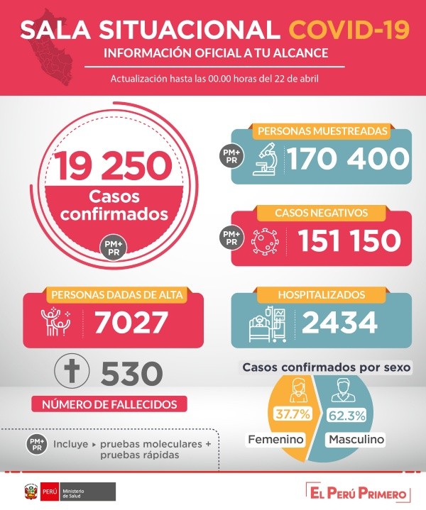 En ese informe, señalan que los casos llegaron a 19 250 de un total de 170 400 de personas muestreadas. Los hospitalizados ya son 2434 y las muertes llegaron a 530.