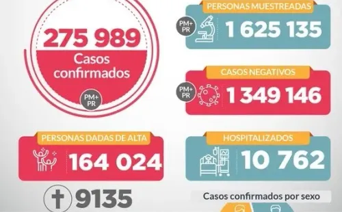 En el nuevo informe, señalaron que de las 1’625,135 personas muestreadas, 275,989 casos resultaron positivos. Las muertes llegaron a 9,135, es decir 196 más en las últimas 24 horas.