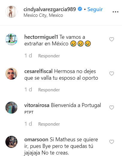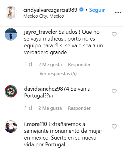 Sin embargo, a quien más les va a hacer falta los hinchas es Cindy Álvarez, la esposa de Mateus, y así se lo hicieron saber en su cuenta de Instagram.