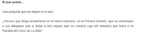 “Acá nos dijo en privado que le gustaría Monterrey, que está en su mente”, aseguran en la columna citada, pero aparentemente, solo si no sigue Antonio Mohamed en el banquillo de los norteños.