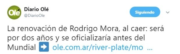 El uruguayo Rodrigo Mora tendría todo preparado para firmar una nueva renovación de contrato con River, alargando su vínculo hasta el 2020 con el club de Nuñez.
