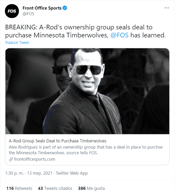 A falta de que se haga oficial la transacción, lo concreto es que laNational Basketball Association (NBA)tendrá a un nuevo propietario en una de sus franquicias, como es el caso de la ex leyenda deMajor League Baseball (MLB), Alex Rodríguez, quien se ha convertido en nuevo dueño de losMinnesota Timberwolves.