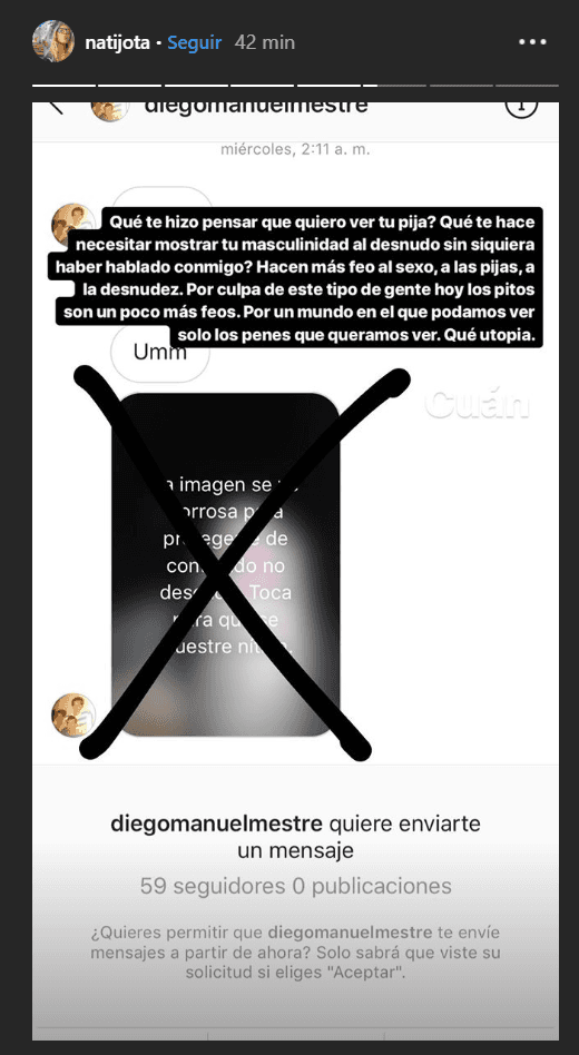 Al parecer, la influencerrecibió una foto ‘prohibida’ de uno de sus seguidores y decidió escracharlo con una historia.
